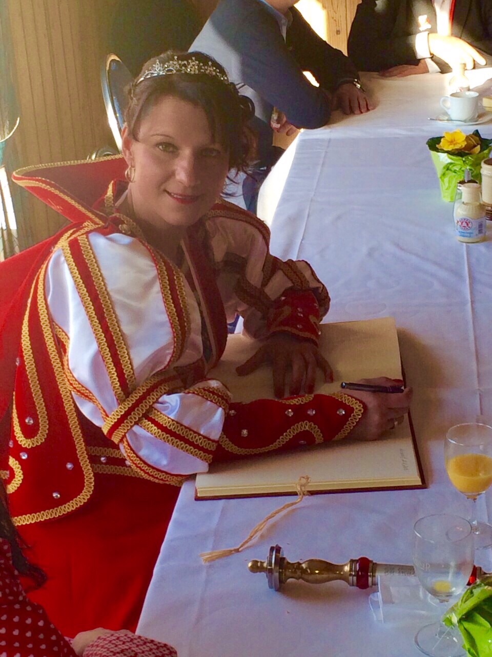 Nach einer kurzen Nacht ging es schon aufregend weiter. Ich freute mich sehr über die Einladung des Elferrates zu einem gemeinsamen Frühstück. Wann kann man denn schon mal mit vielen netten und gut aussehenden Herren als Prinzessin frühstücken? Wir haben die tollen Stunden meiner Proklamation mit ihrem atemberaubenden Auftritt Revue passieren lassen und anschließend hatte ich die Ehre, mich in ihr Elferratsbuch eintragen zu dürfen.